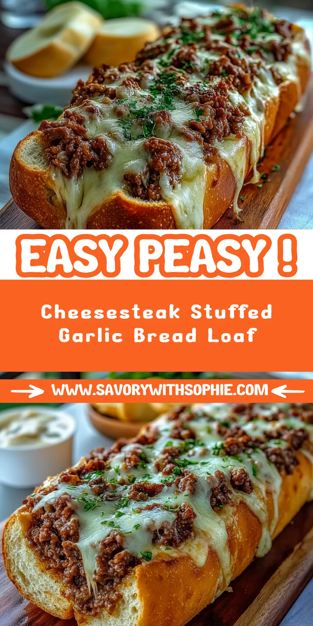 There’s nothing quite like the aroma of fresh garlic bread wafting through the kitchen, promising a comforting and indulgent feast. Now, imagine that scent mingling with the sizzling goodness of thinly sliced steak, perfectly sautéed peppers, and gooey melted cheese, all cradled within a warm, crusty loaf. This is not just any dish; this is the Cheesesteak Stuffed Garlic Bread Loaf. It’s like a party for your taste buds, a delectable creation that easily transforms a simple weeknight dinner into something worth celebrating.